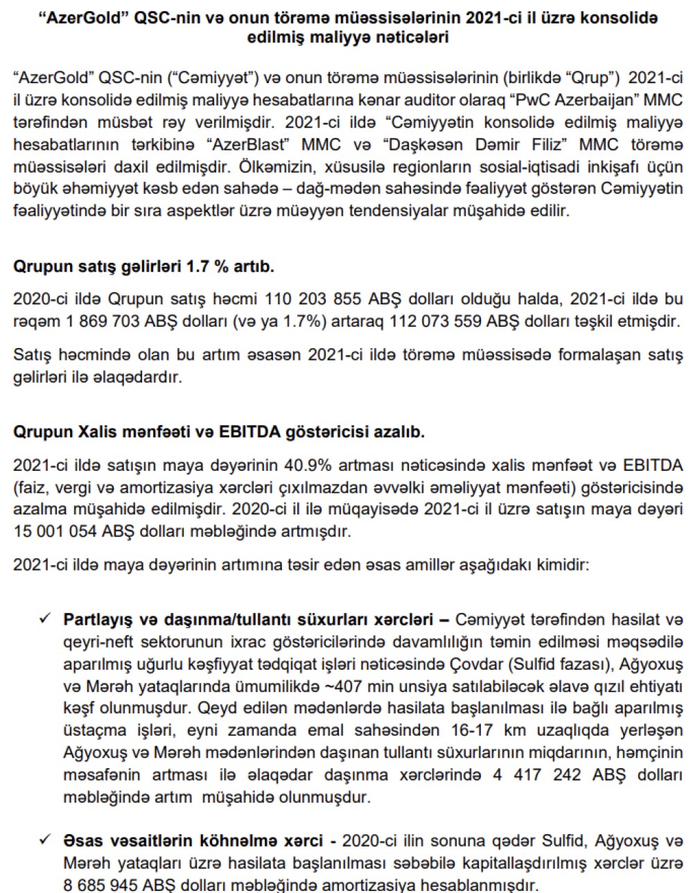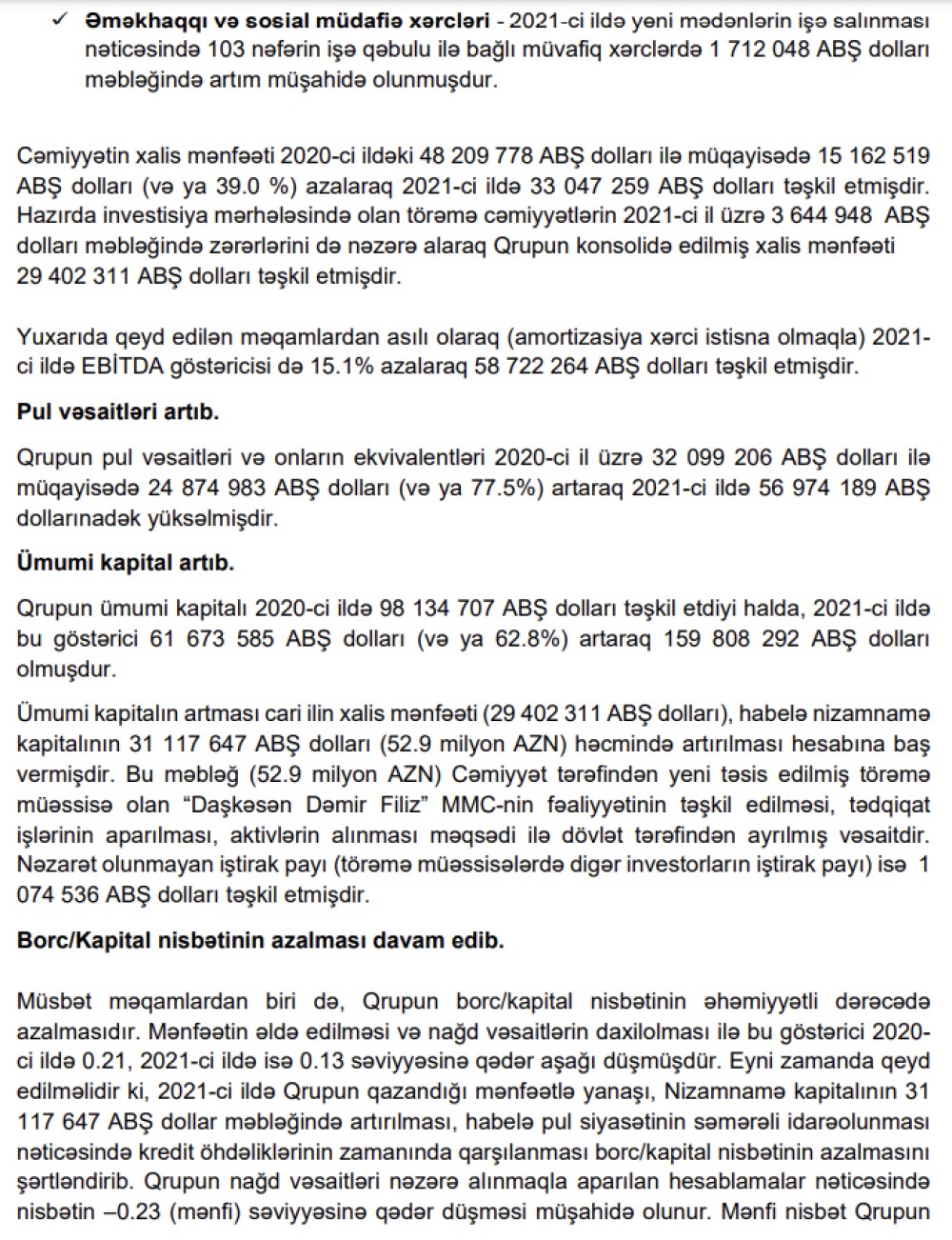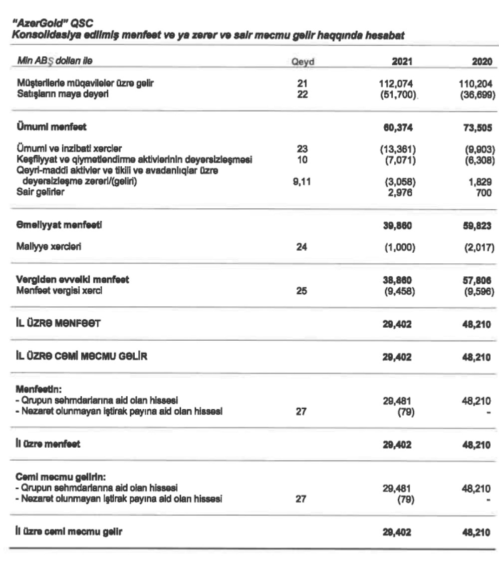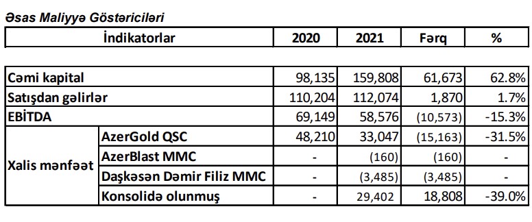 Konsolidə edilmiş hesabata görə, ötən il "AzerGold" qrupunun ("AzerBlast" MMC və "Daşkəsən Dəmir Filiz" MMC daxil) xalis mənfəəti isə 29 milyon 402 min ABŞ dolları təşkil edib. Bu, 2020-ci illə müqayisədə 39% və ya 18 milyon 808 min ABŞ dolları azdır. Qrup 2020-ci ili 48 milyon 210 min dollar xalis mənfəət ilə bağlamışdı.
