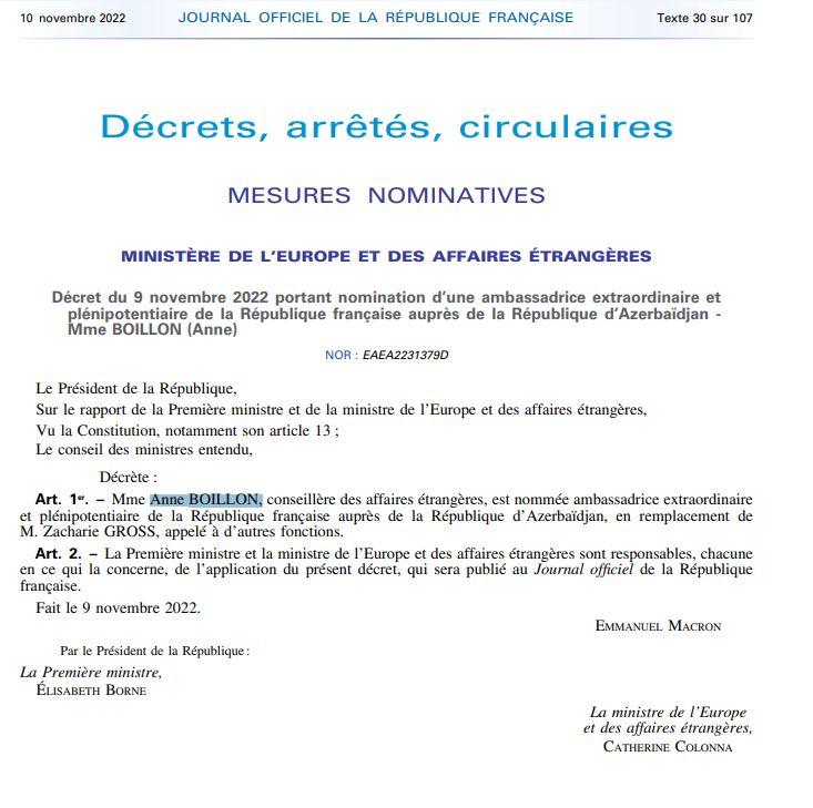 Bildirilib ki, Ann Buayon (Anne Boillon) bundan sonra Fransanın Azərbaycandakı səfiri kimi fəaliyyət göstərəcək.