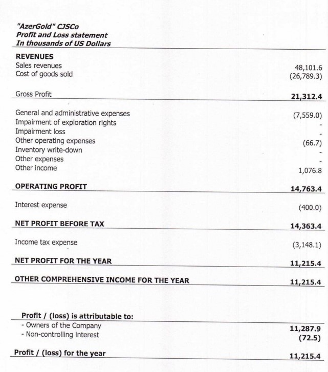 Xatırladaq ki, "AzerGold" QSC 2021-ci ilin 33 milyon 47 min ABŞ dolları xalis mənfəət ilə başa vurmuşdu. Şirkətin xalis mənfəəti 2020-ci illə müqayisədə 2021-ci ildə 31.5% və ya 15 milyon 163 min ABŞ dolları azalmışdı. "AzerGold" QSC 2020-ci ili 48 milyon 210 min ABŞ dolları xalis mənfəət ilə bağlamışdı.