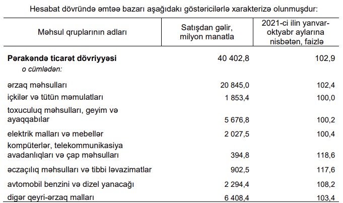2022-ci ilin yanvar-oktyabr aylarında pərakəndə ticarət şəbəkəsində istehlakçılara 40,4 milyard manatlıq, o cümlədən 22,7 milyard manatlıq ərzaq məhsulları, içkilər və tütün məmulatları, 17,7 milyard manatlıq qeyri-ərzaq malları satılmışdır.