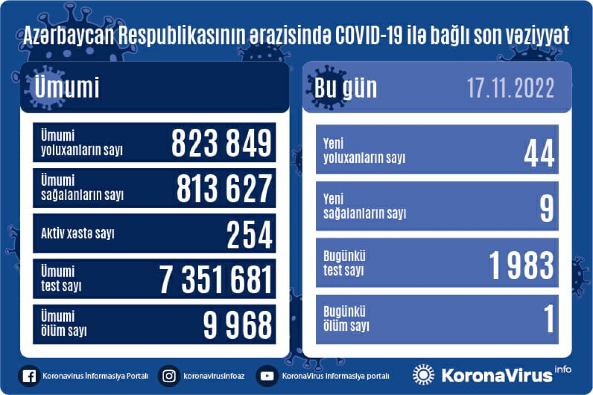 Azərbaycan Respublikasında koronavirus (COVID-19) infeksiyasına 44 yeni yoluxma faktı qeydə alınıb, 9 nəfər müalicə olunaraq sağalıb.