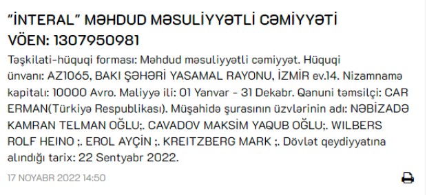 Belə ki, nizamnamə kapitalı 10 min avro olan "İnteral" MMC-nin qanuni təmsilçisi Türkiyə vətəndaşı Car Ermandır. Müşahidə şurasının üzvləri isə Nəbizadə Kamran Telman oğlu, Cavadov Maksim Yaqub oğlu, Wilbers Rolf Heino, Erol Ayçin və Kreitzberg Markdır.