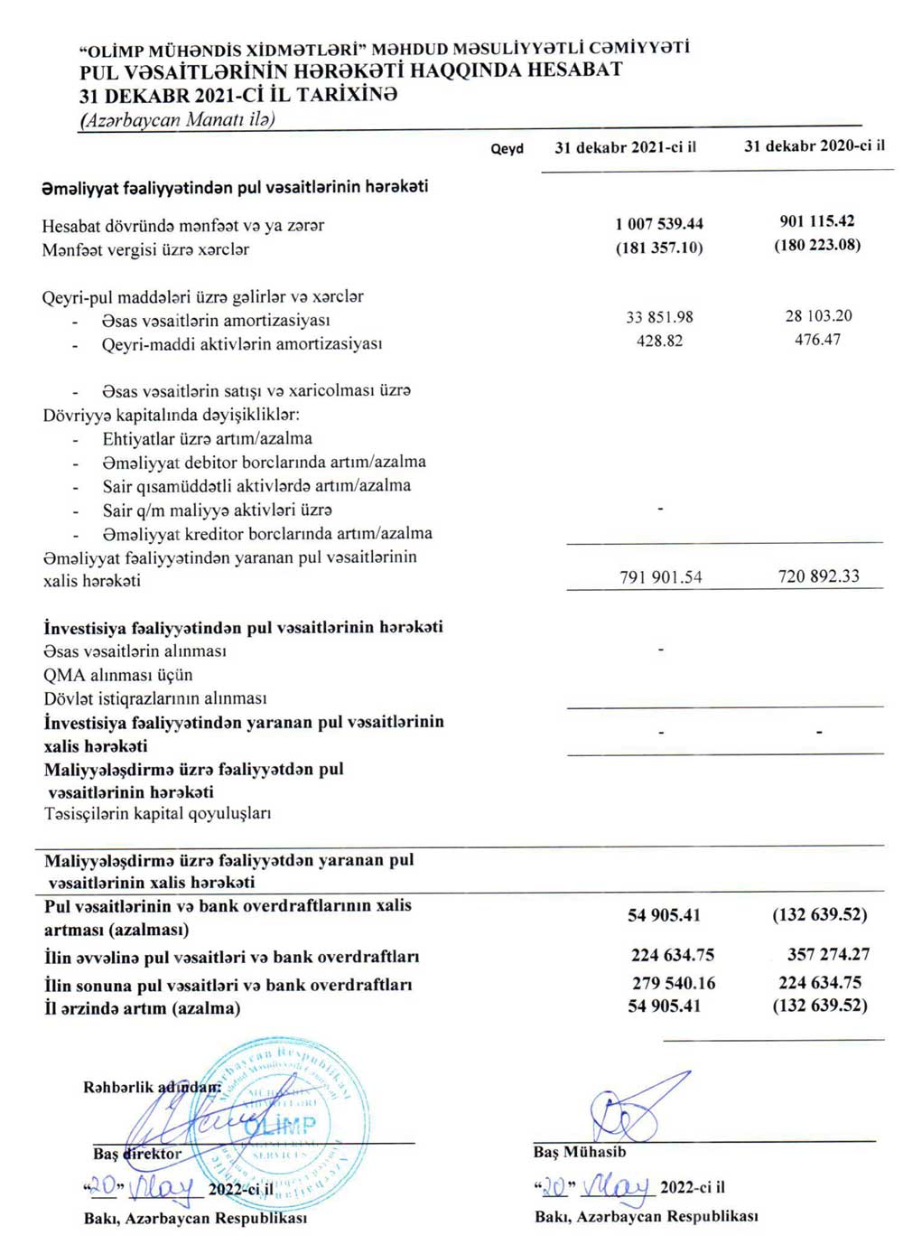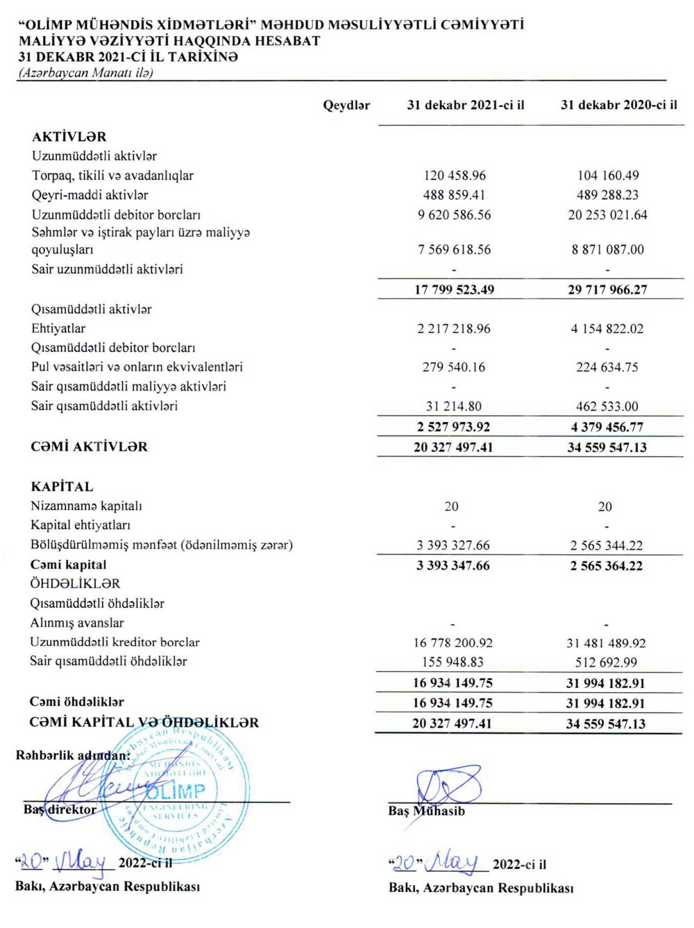 "Olimp Mühəndis Xidmətləri" MMC 2021-ci il üzrə maliyyə göstəricilərini açıqladı
