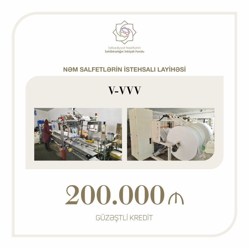 Sahibkarlığın İnkişafı Fondu tərəfindən "V-VVV" MMC-yə nəm salfetlərin istehsalı layihəsi üzrə 200 min manat güzəştli kredit ayrılıb.