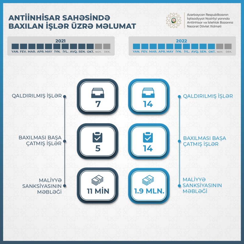 Qeyd edək ki, 2021-ci ilin yanvar-oktyabr aylarında İqtisadiyyat Nazirliyi yanında Antiinhisar və İstehlak Bazarına Nəzarət Dövlət Xidmətində antiinhisar qanunvericiliyinin pozulması əlamətləri üzrə 7 iş qaldırılmış, 5 işin baxılması başa çatdırılmış və 11 min manat maliyyə sanksiyası tətbiq edilmişdi. Beləliklə, tətbiq edilmiş maliyyə sanksiyalarının cəmi məbləği təxminən 173 dəfə artıb.