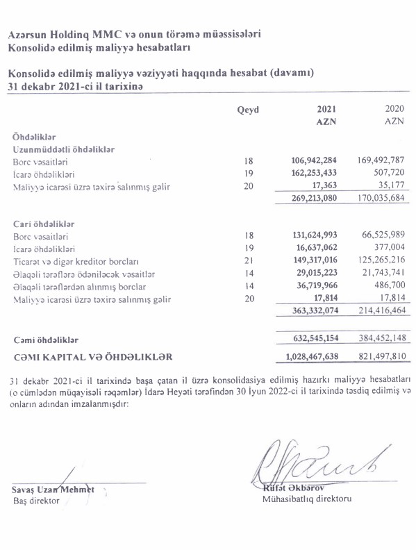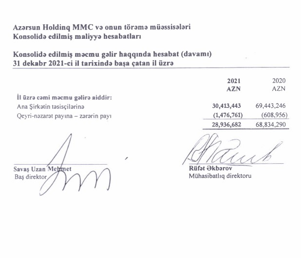 "Azərsun Holdinq" qrupu 2021-ci ili 28 milyon 291 min manat xalis mənfəət ilə başa vurub. 2020-ci illə müqayisədə 2021-ci ildə qrupun xalis mənfəəti 2,6 dəfə azalıb. Qrup 2020-ci ili təxminən 72 milyon 866 min manat xalis mənfəət ilə bağlamışdı.