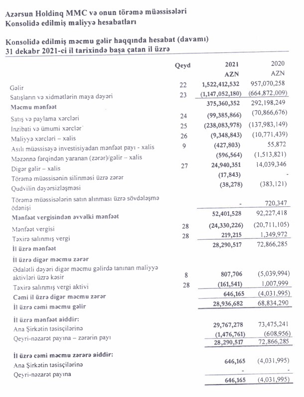 Marja.az "Azərsun Holdinq" MMC və onun törəmə müəssisələrinin konsolidasiya edilmiş maliyyə hesabatlarına istinadən xəbər verir ki, qrupun satışdan gəlirləri artsa da, maya dəyəri, paylama, inzibati və digər xərclərin artması ilə əlaqədar olaraq mənfəəti azalıb. Əgər 2020-ci ildə şirkətin mənfəət vergisindən əvvəlki mənfəəti 92 milyon 227 min manat ikən, 2021-ci ildə 52 milyon 401 min manata düşüb (39 milyon 826 min manat və ya 43,2% azalıb).