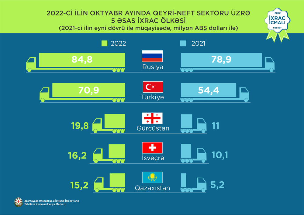 2022-ci ilin yanvar-oktyabr ayları ərzində Rusiya Federasiyasına 687 milyon ABŞ dolları, Türkiyəyə 582,5 milyon ABŞ dolları, Gürcüstana 164,4 milyon ABŞ dolları, İsveçrə Konfederasiyasına 152,6 milyon ABŞ dolları və Qazaxıstana isə 75 milyon ABŞ dolları dəyərində qeyri-neft sektoruna aid mal ixrac olunub.