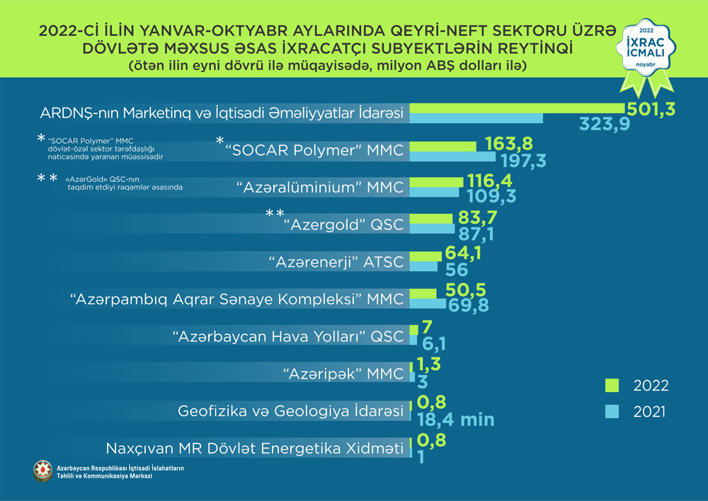 Marja xəbər verir ki, “İxrac İcmalı” tərəfindən qeyri-neft sektoru üzrə 2022-ci ilin yanvar-oktyabr aylarında həyata keçirilən ixracla bağlı həm qeyri-dövlət, həm də dövlətə məxsus ixracatçı subyektlərin reytinqi tərtib edilib.