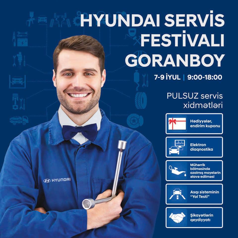 Şirkətdən “Marja”ya verilən məlumata görə, Hyundai-ın Goranboy serivisi ərazisində keçiriləcək festivalda avtomobillərin pulsuz elektron diaqnostikası, mühərrik bölməsindəki azalmış yağların əlavəsi həyata keçiriləcəkdir. Həmçinin avtomobil sahiblərini hədiyyələr, endirim kuponu, balacaları da əyləncə və hədiyyələr gözləyir.