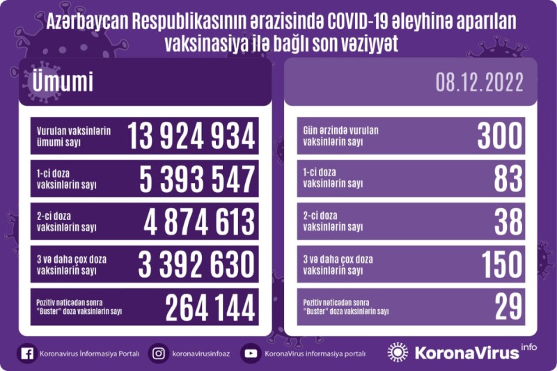Azərbaycanda son sutkada koronavirus (COVID-19) əleyhinə 300 vaksin vurulub. Bir gündə birinci mərhələ üzrə vaksinasiya olunanların sayı 83, ikinci mərhələ üzrə vaksinasiya olunanların sayı 38, üç və daha çox doza vaksin vurduranların sayı 150, pozitiv nəticədən sonra buster doza üzrə vaksinasiya olunanların sayı isə 29 nəfərdir.