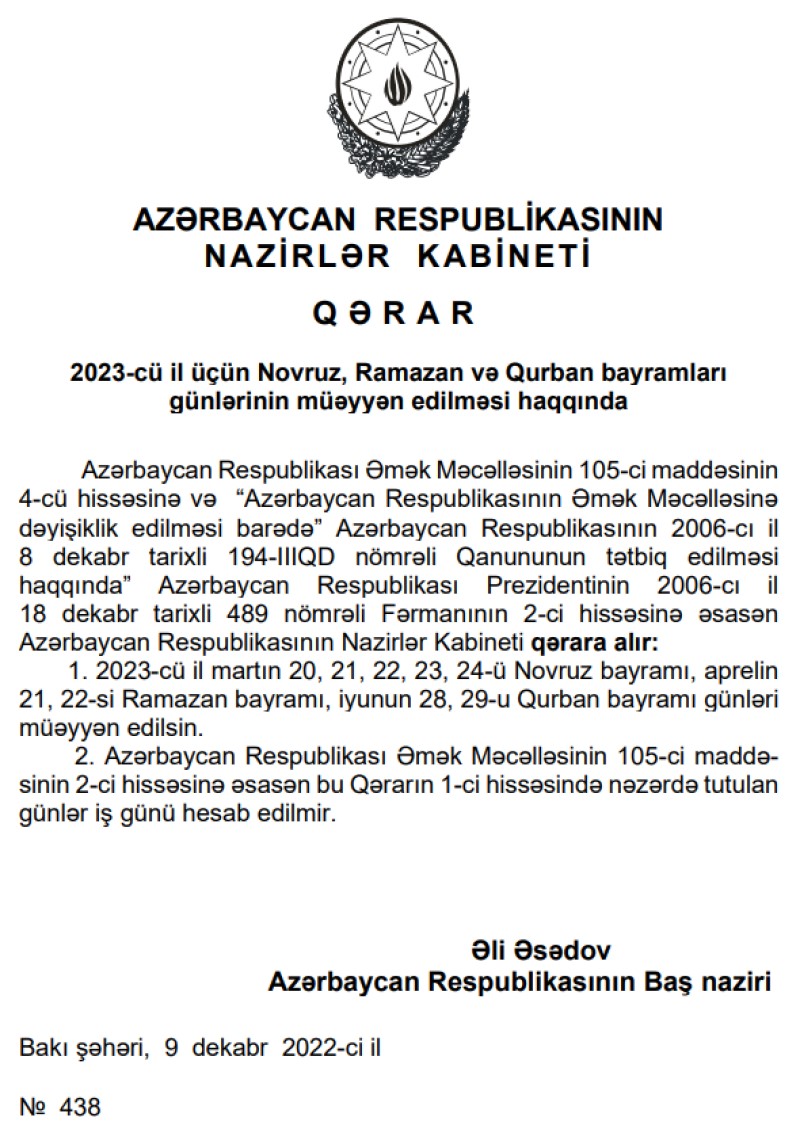 Azərbaycan Respublikası Nazirlər Kapineti "2023-cü il üçün Novruz, Ramazan və Qurban bayramları günlərinin müəyyən edilməsi haqqında" qərar qəbul edib.