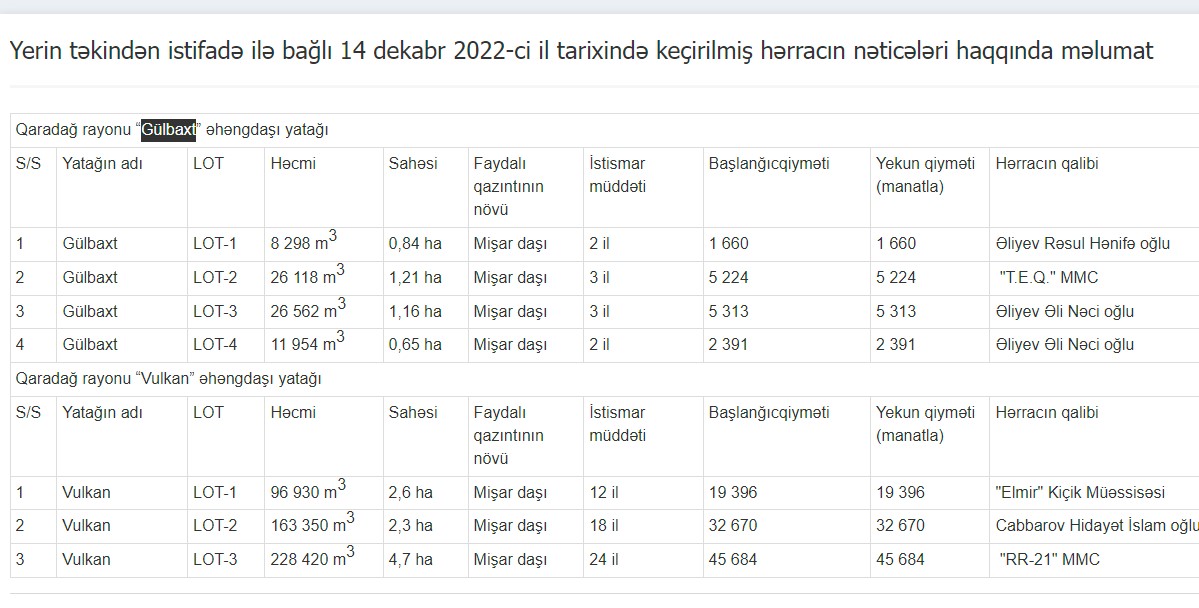 “Gülbaxt” əhəngdaşı yatağı üzrə hərracın qalibləri Əliyev Rəsul Hənifə oğlu, "T.E.Q." MMC və Əliyev Əli Nəci oğludur.