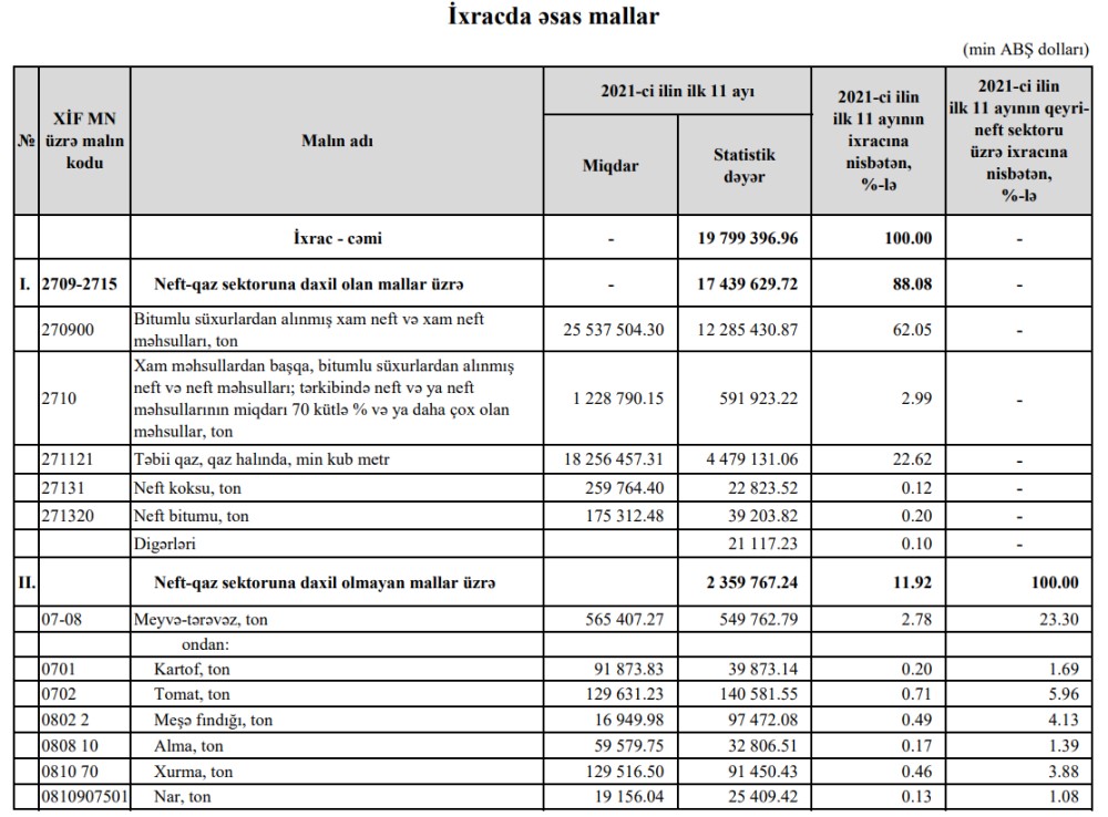 Müqayisə üçün qeyd edək ki, 2021-ci ilin 11 ayında Azərbaycanın ixracının həcmi - neft-qaz sektoruna daxil olan mallar üzrə 17 milyard 439 milyon 629 min dollar, neft-qaz sektoruna daxil olmayan mallar üzrə 2 milyard 359 milyon 767 min dollar təşkil etmişdi. Neft-qaz sektoruna daxil olan mallar üzrə ixrac 2021-ci ilin 11 ayının ixracının 88%-nə bərabər olmuşdu. O cümlədən, 2021-ci ilin 11 ayında Azərbaycandan 12 milyard 285 milyon 430 min dollar dəyərində xam neft, 4 milyard 479 milyon 131 min dollar dəyərində təbii qaz ixrac edilmişdi.