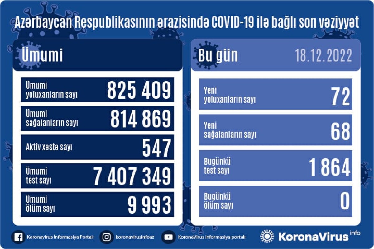 Azərbaycanda koronavirus (COVID-19) infeksiyasına 72 yeni yoluxma faktı qeydə alınıb, 68 nəfər müalicə olunaraq sağalıb.
