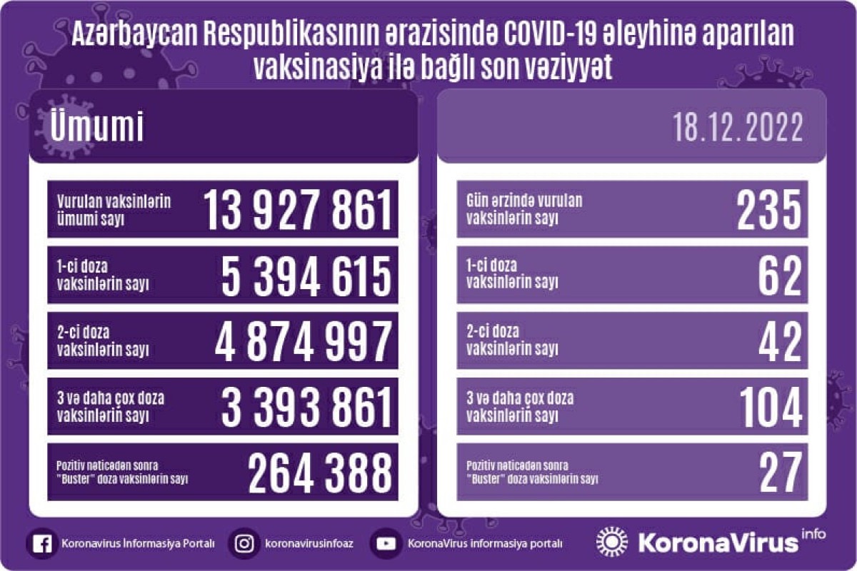 Azərbaycanda son sutkada koronavirus (COVID-19) əleyhinə 235 vaksin vurulub.