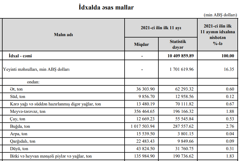 Qeyd edək ki, 2021-ci ilin 11 ayı ərzində Azərbaycana 1 milyard 701 milyon 620 min dollar dəyərində, 2021-ci ilin 12 ayı ərzində isə 1 milyard 929 milyon 891 min dollar dəyərində yeyinti məhsulları idxal edilmişdi.