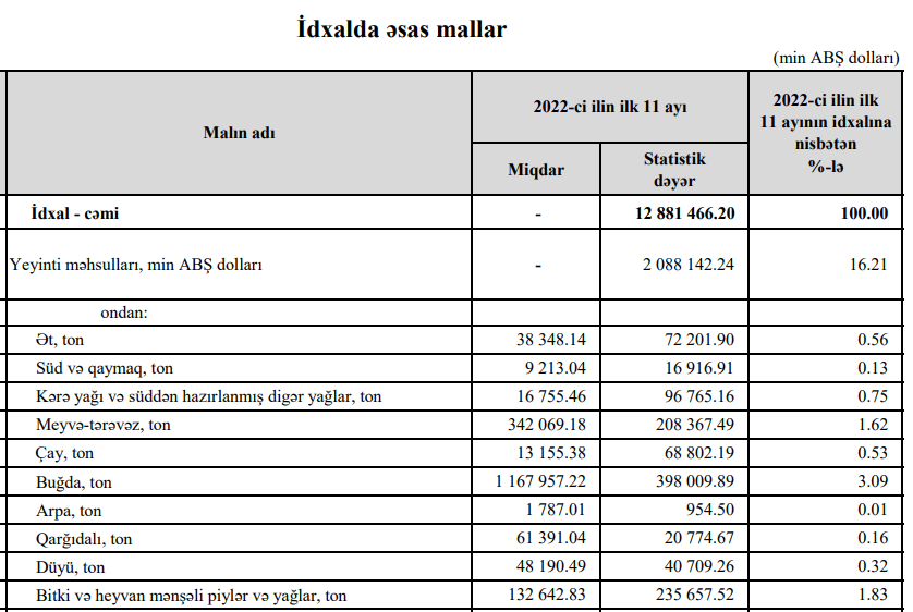 2022-ci ilin 11 ayı ərzində Azərbaycana 2 milyard 88 milyon 142 min dollar dəyərində yeyinti məhsulları idxal edilib.