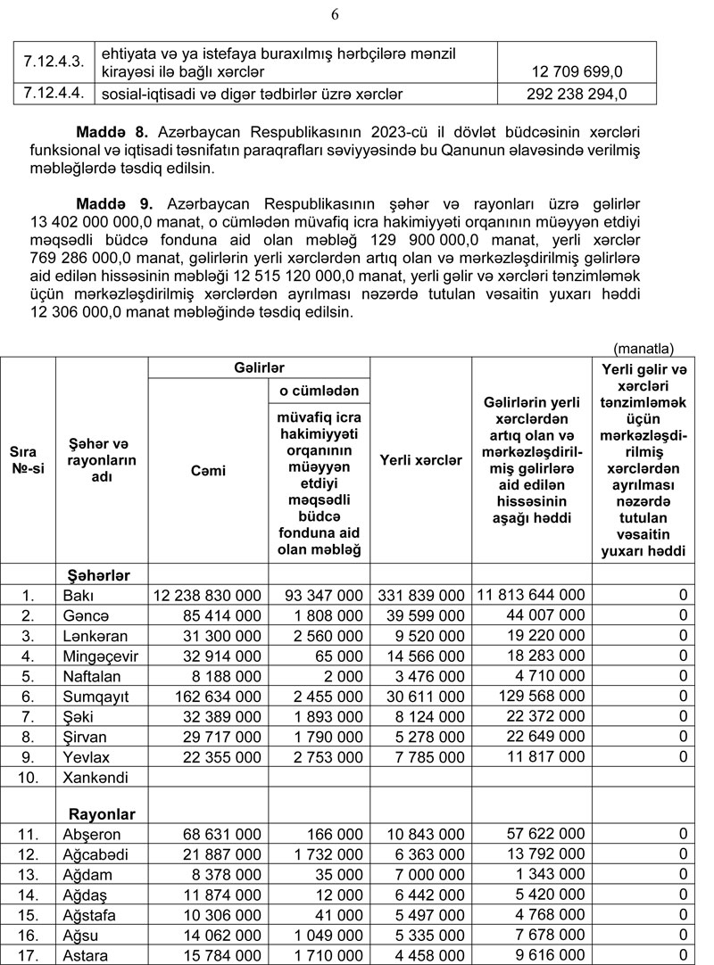 Marja.az xəbər verir ki, Azərbaycan Respublikasının 2023-cü il dövlət büdcəsinin gəlirləri 30 milyard 773 milyon 978 min manat, xərcləri 33 milyard 353 milyon 278 min manat (o cümlədən, mərkəzləşdirilmiş gəlirləri 30 milyard 16 milyon 998 min manat, yerli gəlirləri 756 milyon 980 min manat, mərkəzləşdirilmiş xərcləri 32 milyard 583 milyon 992 min manat, yerli xərcləri 769 milyon 286 min manat) məbləğində təsdiq edilib.