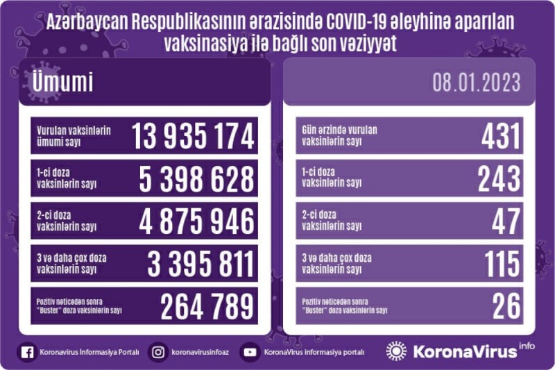 Azərbaycanda son sutkada koronavirus (COVID-19) əleyhinə 431 vaksin vurulub. Bir gündə birinci mərhələ üzrə vaksinasiya olunanların sayı 243, ikinci mərhələ üzrə vaksinasiya olunanların sayı 47, üç və daha çox doza üzrə vaksinasiya olunanların sayı 115, pozitiv nəticədən sonra buster doza üzrə vaksinasiya olunanların sayı 26 nəfərdir.