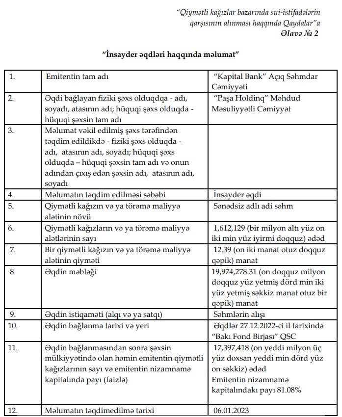 Marja.az “İnsayder əqdləri haqqında məlumat"a istinadən xəbər verir ki, Bankın yeni səhmlərini “PAŞA Holdinq” Məhdud Məsuliyyətli Cəmiyyət alıb.