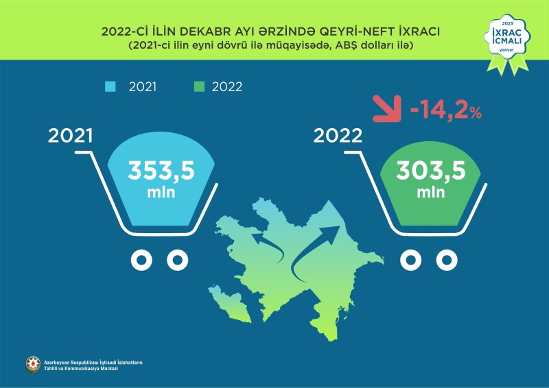 2022-ci ilin dekabr ayının qeyri-neft ixracı 303,5 milyon ABŞ dolları təşkil edib. 2022-ci ilin dekabr ayı ərzində yeyinti məhsulları üzrə ixrac 105,6 milyon ABŞ dolları, qeyri-yeyinti məhsulları üzrə isə 197,9 milyon ABŞ dollarına bərabər olub.