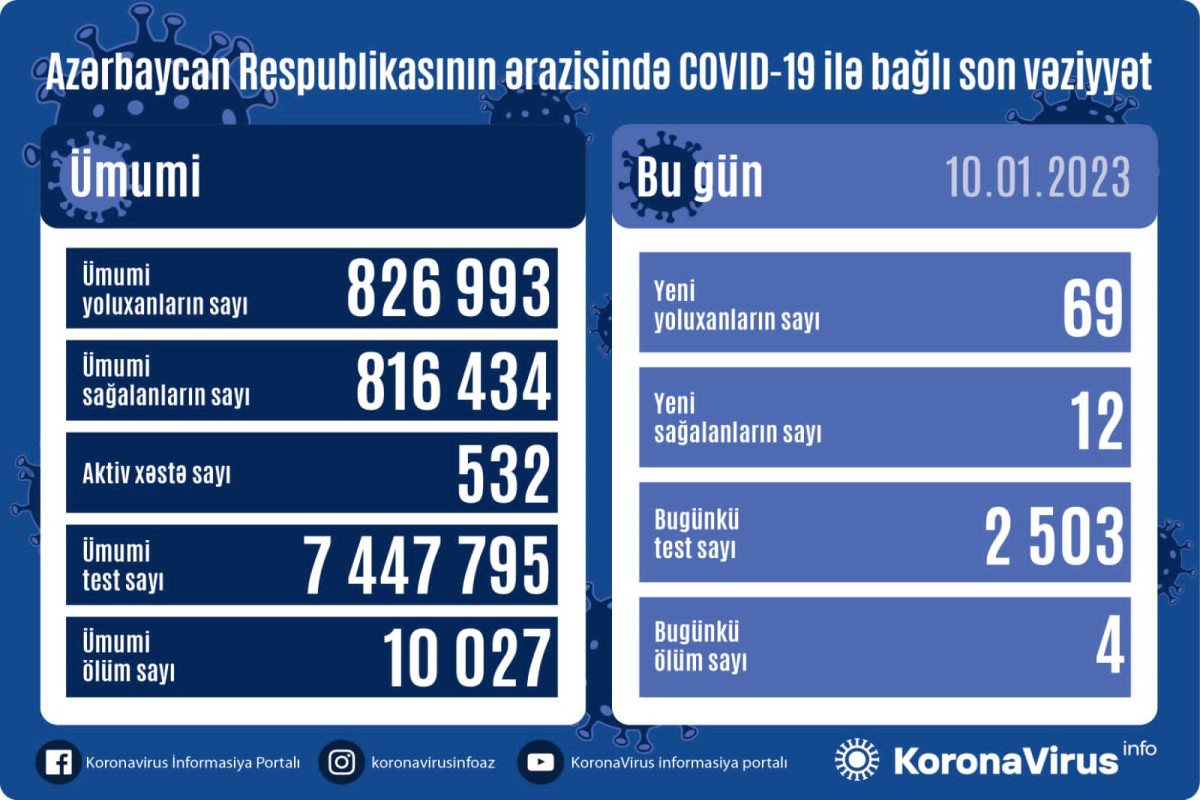 Azərbaycanda daha 69 nəfər COVID-19-a yoluxub, 4 nəfər vəfat edibAzərbaycan Respublikasında koronavirus (COVID-19) infeksiyasına 69 yeni yoluxma faktı qeydə alınıb, 12 nəfər müalicə olunaraq sağalıb.