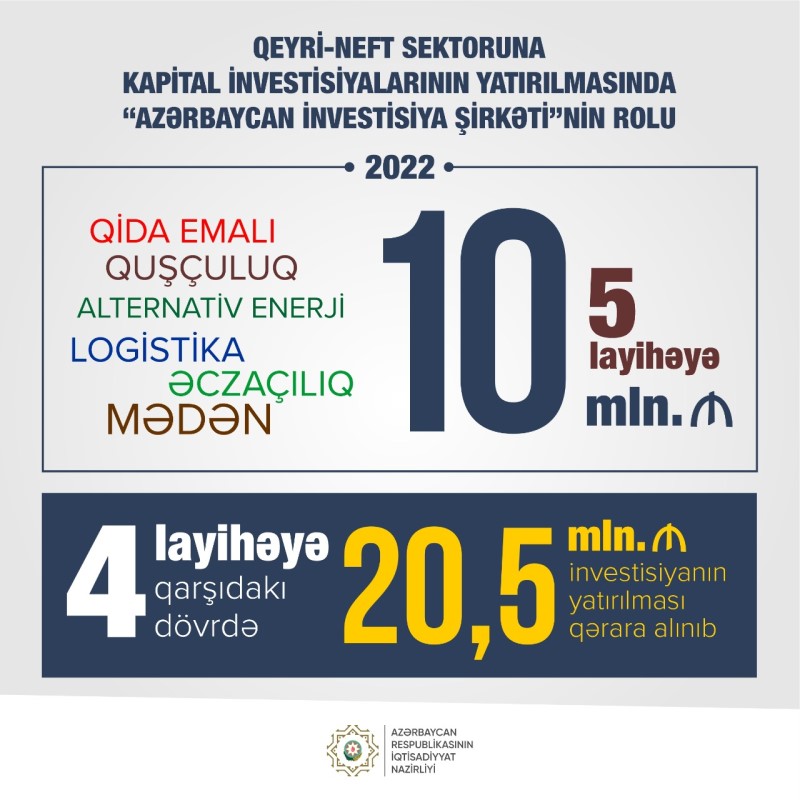 Marja-nın məlumatına görə, iqtisadiyyat naziri Mikayıl Cabbarov Tvitter səhifəsində bildirib ki, 2022-ci ildə AİŞ tərəfindən qida emalı, quşçuluq, alternativ enerji, logistika, əczaçılıq və mədən sahələrində 5 layihəyə 10 milyon manat sərmayə yatırılıb, daha 4 layihə üzrə qarşıdakı dövrdə 20,5 milyon manat investisiyanın yatırılması qərara alınıb.