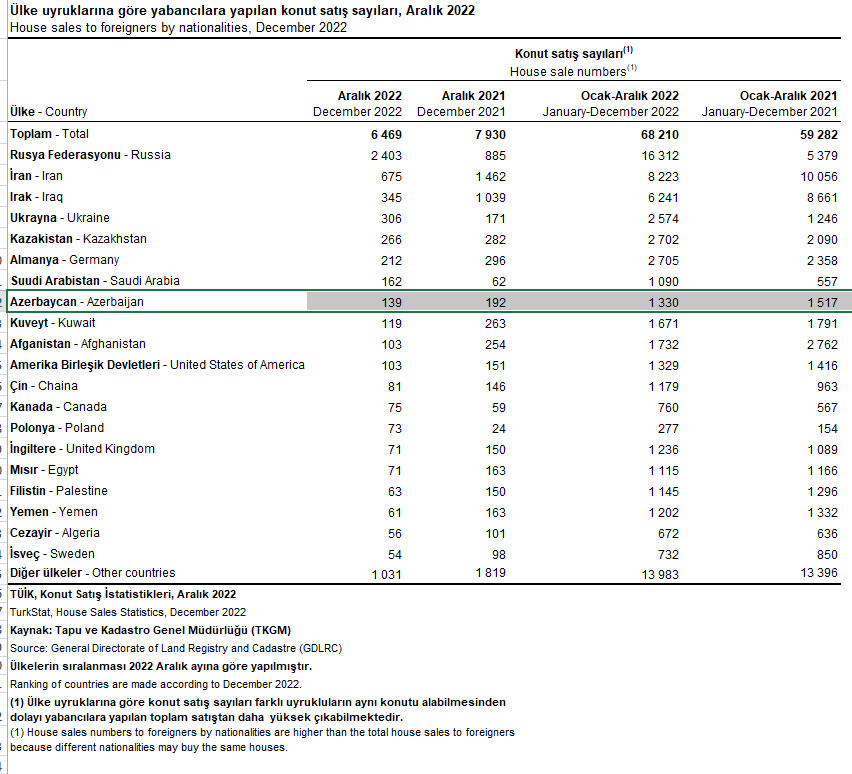 2022-ci il ərzində Azərbaycan vətəndaşları Türkiyədə 1330 mənzil (ev) alıblar. Halbuki, azərbaycanlılar 2021-ci ildə qardaş ölkədə 1517 evə sahib olmuşdular.