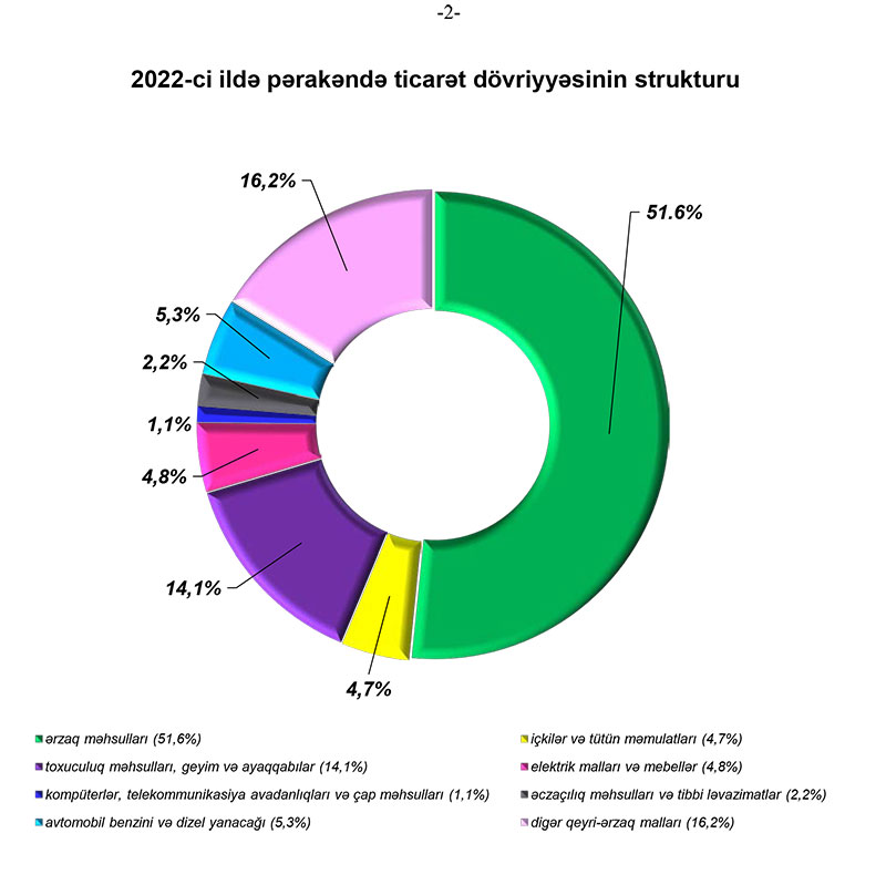 2022-ci ildə alıcıların pərakəndə ticarət şəbəkəsində aldıqları mallara xərclədiyi vəsaitin 51,6 faizi ərzaq məhsullarının, 4,7 faizi içkilər və tütün məmulatlarının, 14,1 faizi toxuculuq məhsulları, geyim və ayaqqabıların, 5,3 faizi avtomobil benzini və dizel yanacağının, 4,8 faizi elektrik malları və mebellərin, 2,2 faizi əczaçılıq məhsulları və tibbi ləvazimatların, 1,1 faizi kompüterlər, telekommunikasiya avadanlıqları və çap məhsullarının, 16,2 faizi isə digər qeyriərzaq mallarının alınmasına sərf olunmuşdur.