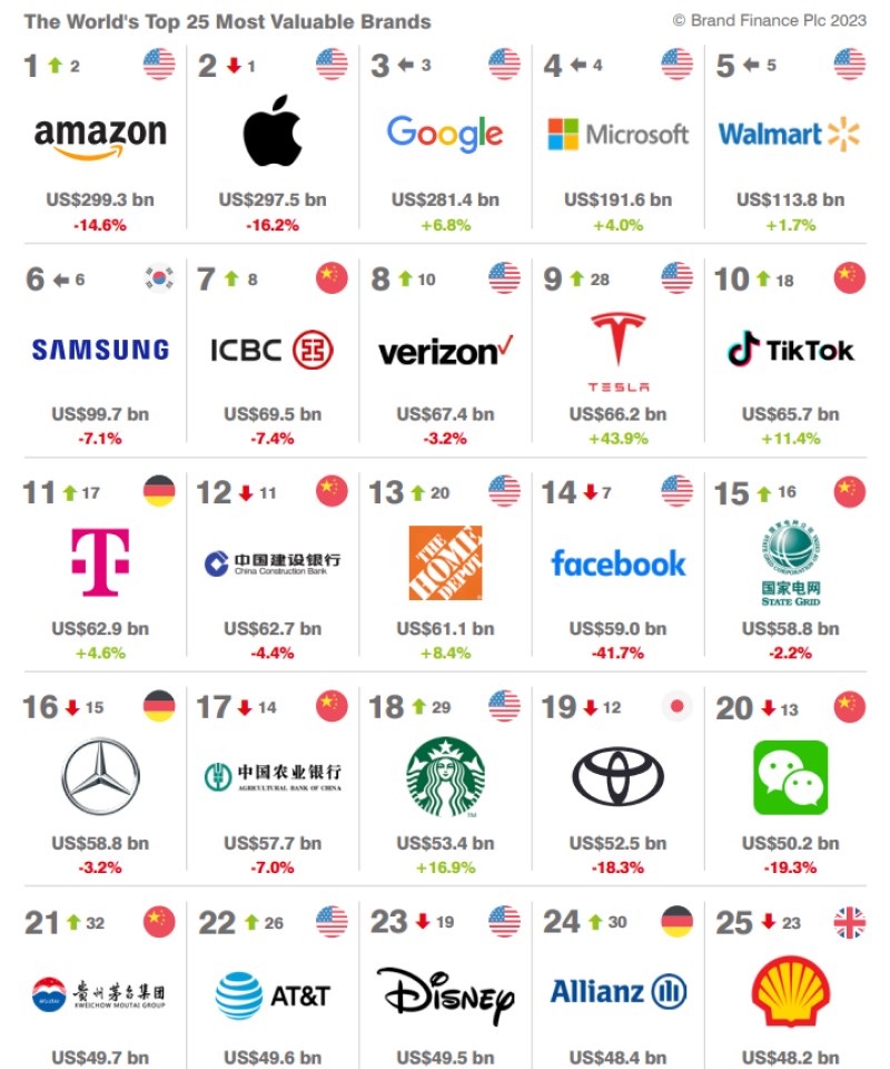 Dəyərini itirmiş digər texnologiya yönümlü brendlər siyahısına - Samsung Group (brend dəyəri 7% azalaraq 99,7 milyard ABŞ dolları olub), Alibaba.com (brend dəyəri 56% azalaraq 10,0 milyard ABŞ dolları olub), Facebook (brend dəyəri 42% azalaraq 59,0 milyard ABŞ dolları olub) və WeChat (brend dəyəri 19% azalaraq 50,2 milyard ABŞ dolları təşkil edib) daxildir.
