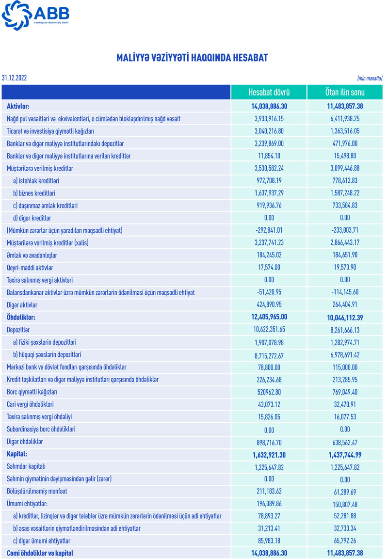 Əsasən dövlətə məxsus “ABB” ASC (Azərbaycan Beynəlxalq Bankı) 2022-ci il üzrə maliyyə göstəricilərini açıqlayıb.