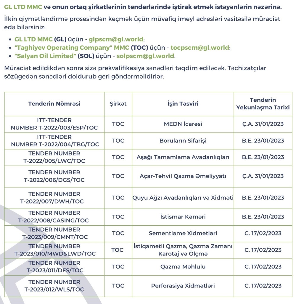 GL şirkəti tenderlər elan edir.