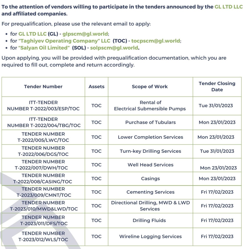 GL və onun ortaq şirkətlərinin tenderlərində iştirak etmək istəyirsinizsə, müraciət qaydası ilə bağlı məlumatlara nəzər salın.