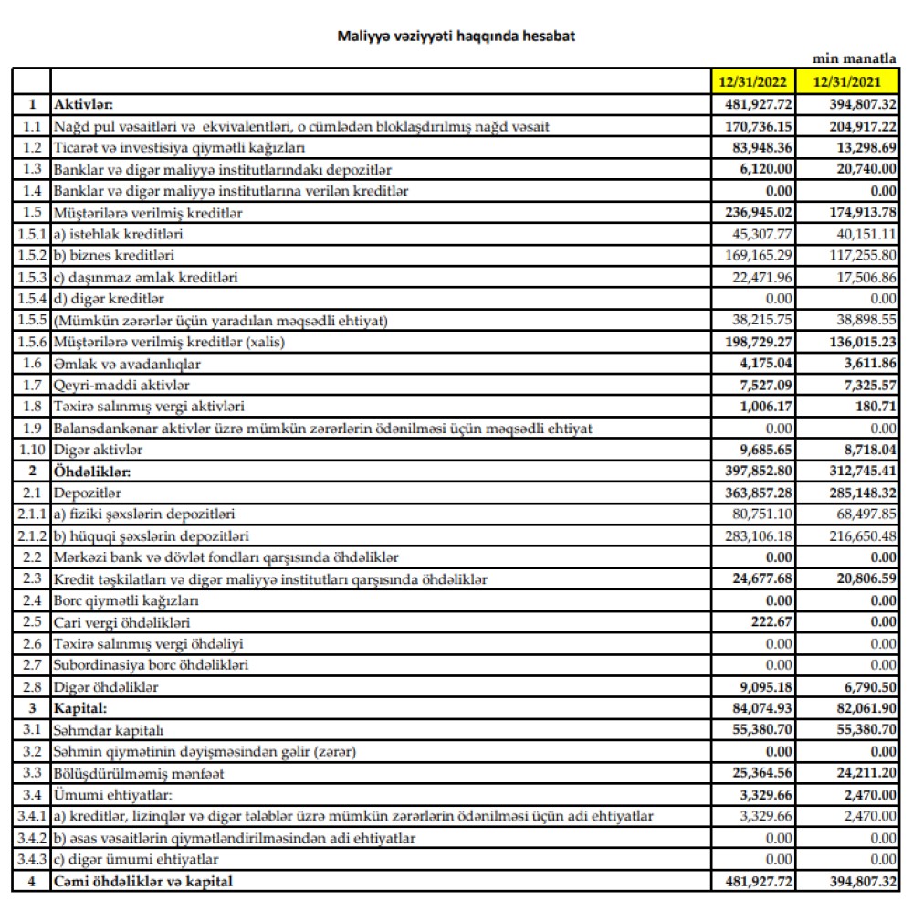 Maliyyə nəticələrinə əsasən, 2021-ci illə müqayisədə 2022-ci ildə bankın aktivlərinin həcmində 22.1% artım qeydə alınıb. Bununla da hesabat dövrünə bankın cəmi aktivləri 481.9 milyon manat təşkil edib.