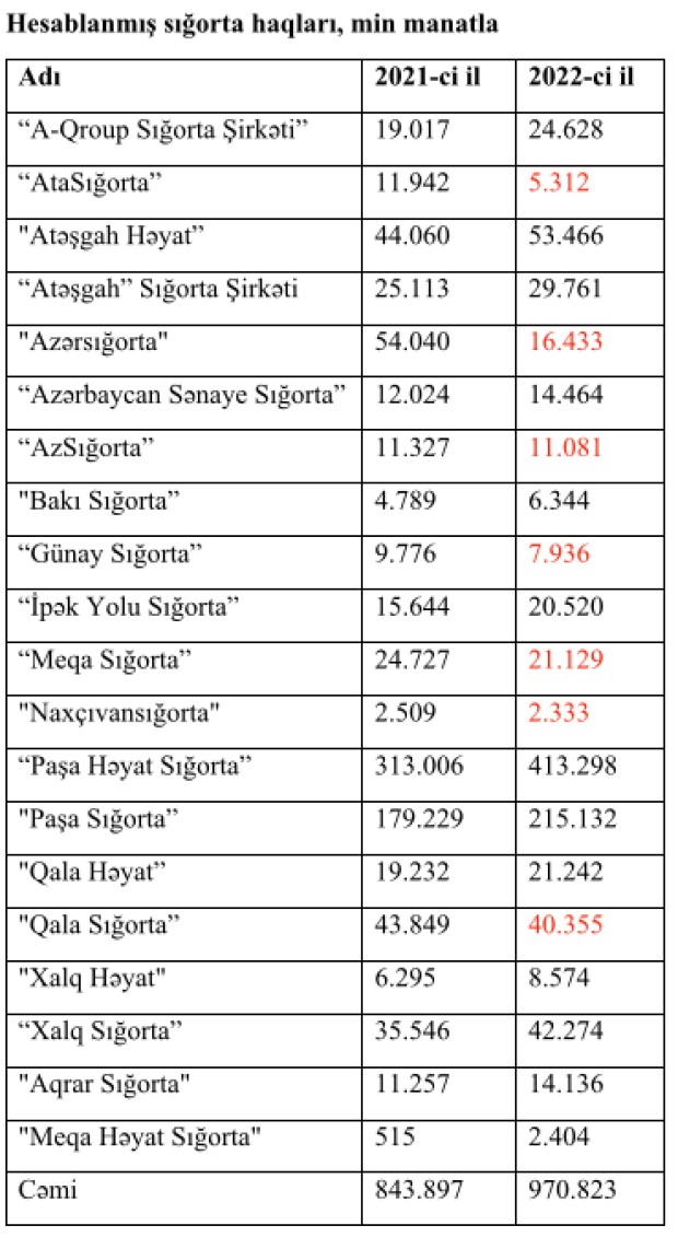 Marja.az xəbər verir ki, “AtaSığorta”, "Azərsığorta", “AzSığorta”, "Günay Sığorta”, “Meqa Sığorta”, "Naxçıvansığorta" və “Qala Sığorta” daha az sığorta haqları hesablayıblar.