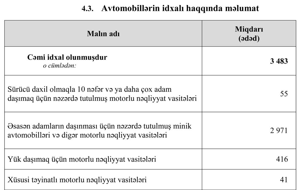 2017-ci ilin Yanvar-May aylarında Azərbaycana 2 657 ədəd avtomobil (nəqliyyat vasitəsi), 2 240 ədəd minik avtomobili gətirilmişdi. Bu ilin İyununda 826 ədəd nəqliyyat vasitəsi idxal olunub. İyunda minik avtomobili idxalı isə 731 ədəd təşkil edib.