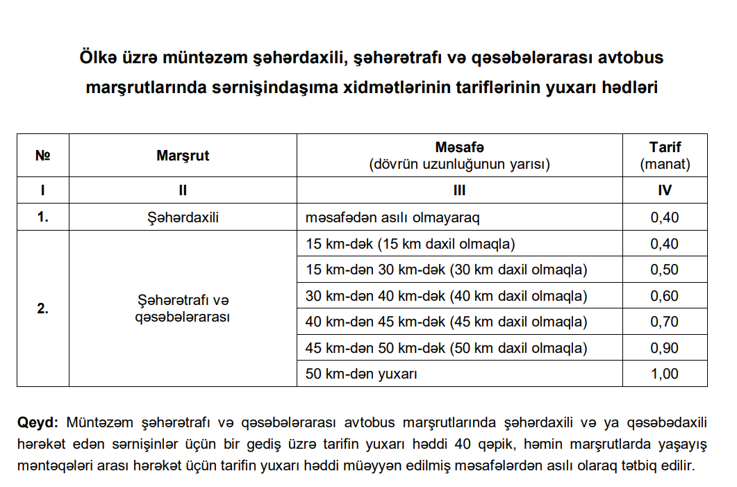 Məlumat üçün qeyd edək ki, şəhərdaxili, şəhərətrafı və qəsəbələrarası, həmçinin şəhərlərarası avtobus marşrutlarında sərnişindaşıma xidməti üzrə tariflərin yuxarı həddi və metroda sərnişindaşıma xidmətinin tarifi ilə bağlı sonuncu qərar 2018-ci ilin avqust ayında qüvvəyə minmişdir.
