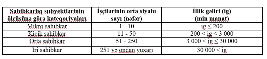 Qeyd: Nazirlər Kabinetinin 21 dekabr 2018-ci il tarixli 556 nömrəli Qərarı ilə təsdiq edilmiş “Mikro, kiçik, orta və iri sahibkarlıq subyektlərinin bölgüsü meyarları” aşağıdakı kimi qeyd edilmişdir: