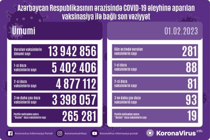 Azərbaycanda son sutkada koronavirus (COVID-19) əleyhinə 281 vaksin vurulub. Bir gündə birinci mərhələ üzrə vaksinasiya olunanların sayı 88, ikinci mərhələ üzrə vaksinasiya olunanların sayı 93, üç və daha çox doza üzrə vaksinasiya olunanların sayı 81, pozitiv nəticədən sonra buster doza üzrə vaksinasiya olunanların sayı 19 nəfərdir.