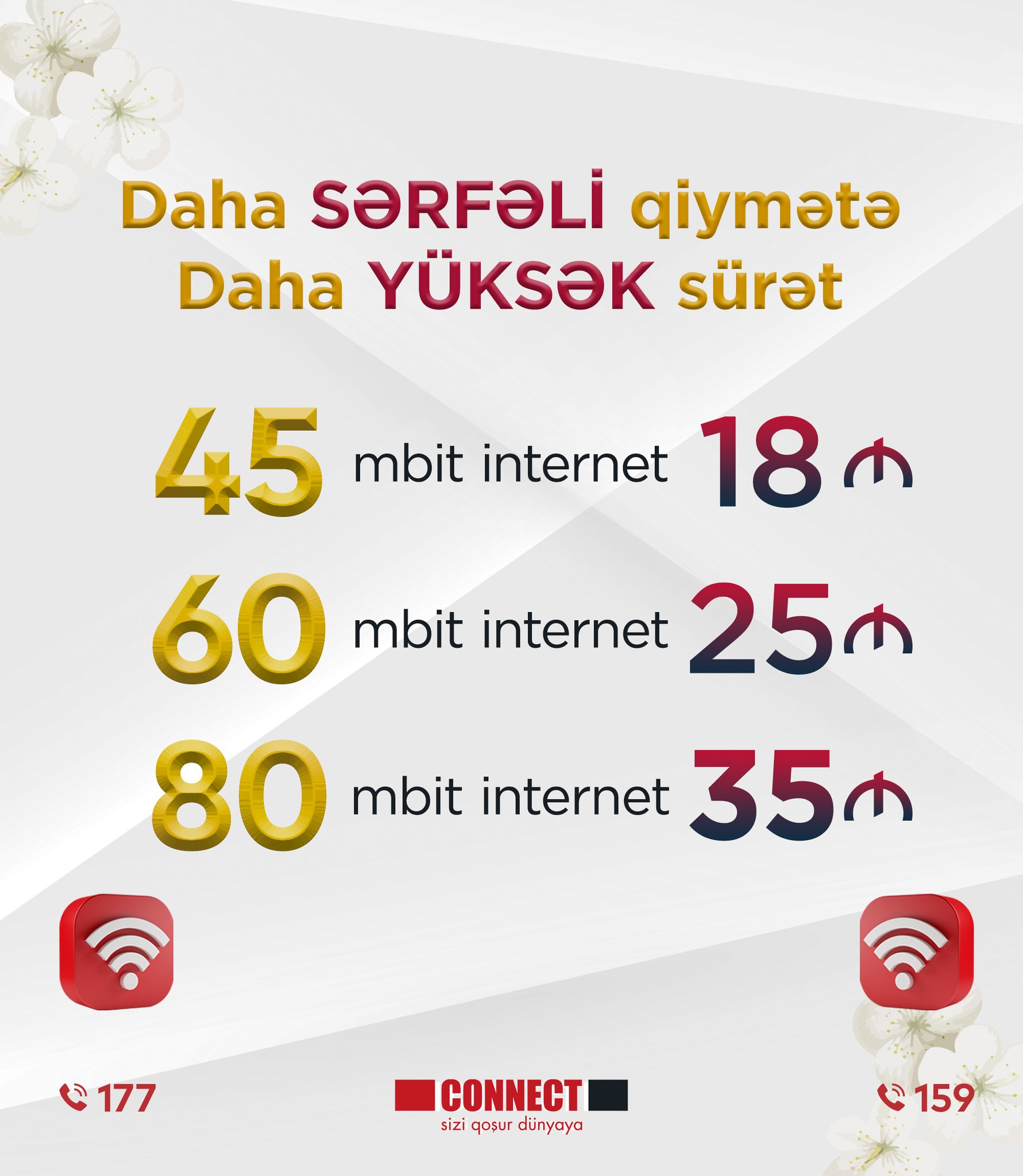 İndiyədək, "Connect" fərdi fiber optik İnterneti üzrə 18 manata 20 Mb/san, 25 manata 35 Mb/san, 35 manata isə 45 Mb/san sürət təqdim edirdi.