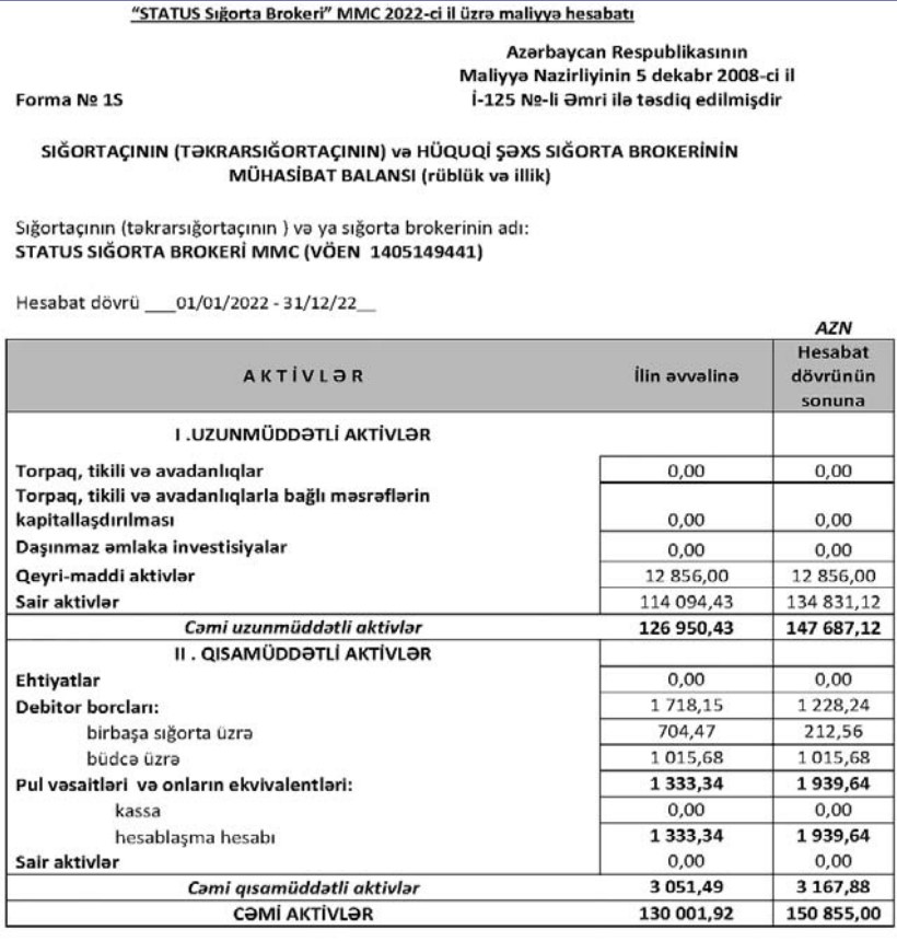 Ötən il "Status Sığorta Brokeri"nin cəmi aktivləri 2021-ci ilin sonundakı 130 min manatdan 2022-ci ilin sonunda 151 min manata yüksəlib.