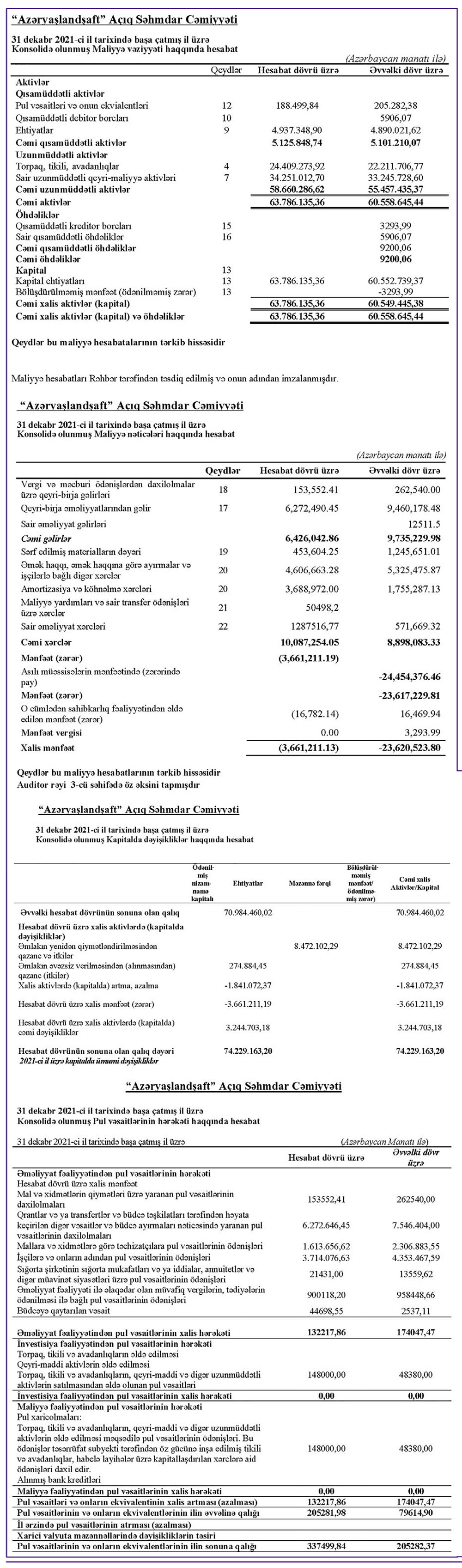 Ekologiya və Təbii Sərvətlər Nazirliyinin “Azərbaycan Yaşıllaşdırma və Landşaft Quruluşu” Açıq Səhmdar Cəmiyyəti (“Azəryaşlandşaft” ASC) 2021-ci ili 3 milyon 661 min manat xalis zərər ilə başa vurub. Şirkət 2020-ci ili 23 milyon 620 min manat xalis zərər ilə bağlamışdı.