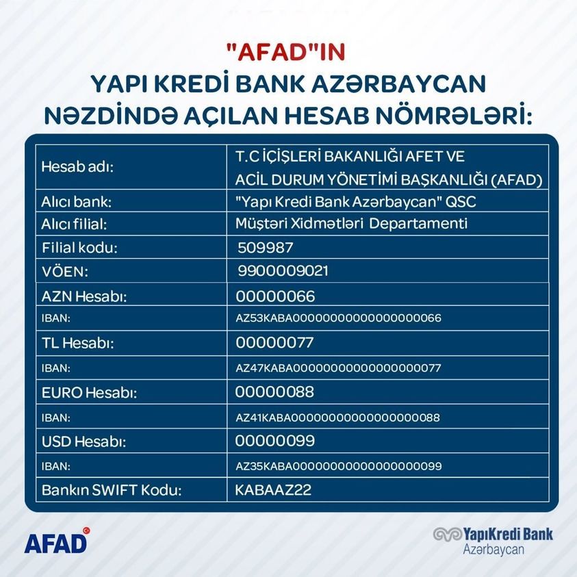 Qeyd edilib ki, yardım etmək istəyən hər hansı fiziki şəxs və ya hüquqi şəxs filiallardan, internet / mobil bankçılıq və HÖP (Hökumət Ödəniş Portalı) vasitəsilə vəsaiti artıq qeyd olunan hesaba komissiyasız köçürə və ya nağd yatıra bilər. Həmçinin Bankın Əhmədli, Səbail, Nərimanov və 28 May filiallarında yerləşən və 7/24 xidmət göstərən Cash-in ATM -lərindən AFAD fondunun AZN (00000066) və ya USD (00000099) hesab nömrəsini qeyd etməklə ianə etmək mümkündür.