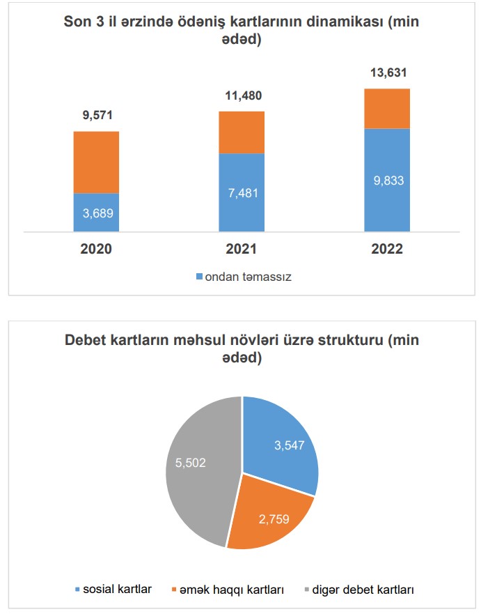 2022-ci il ərzində ölkə daxilində ödəniş kartları ilə aparılmış əməliyyatların ümumi həcmi 2021-ci il ilə müqayisədə 56% artaraq 56.4 mlrd. manat, o cümlədən nağdsız ödənişlərin həcmi 2.1 dəfə artaraq 24.4 mlrd. manat olmuşdur. Ödəniş kartları ilə aparılmış ölkədaxili əməliyyatlarda nağdsız hesablaşmaların xüsusi çəkisi 2022-ci il ilə müqayisədə 11.4% bəndi yüksələrək 43.2%-ə bərabər olmuşdur.