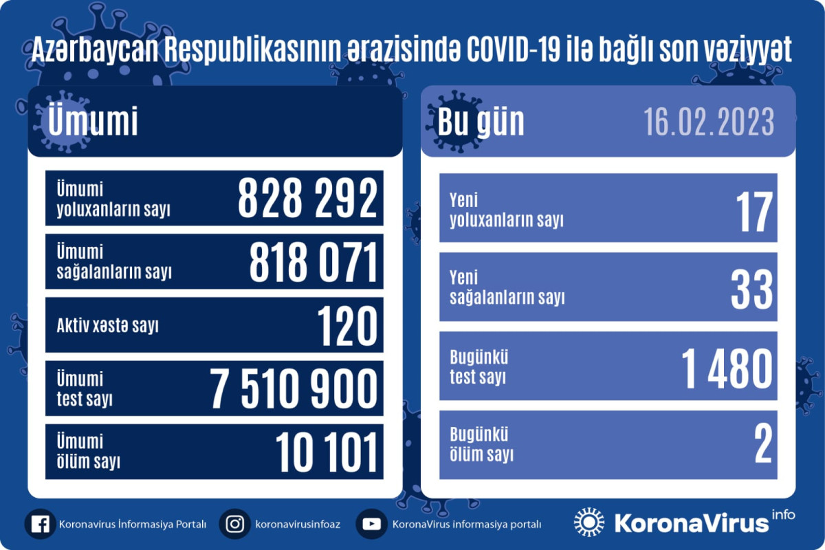 Azərbaycan Respublikasında koronavirus (COVID-19) infeksiyasına 17 yeni yoluxma faktı qeydə alınıb, 33 nəfər müalicə olunaraq sağalıb.