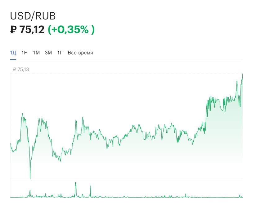 Marja xəbər verir ki, dolların məzənnəsi 15 qəpik də artaraq 75 rubla çatıb. Bu, ötən ilin 25 aprel tarixindən bəri ilk dəfədir.