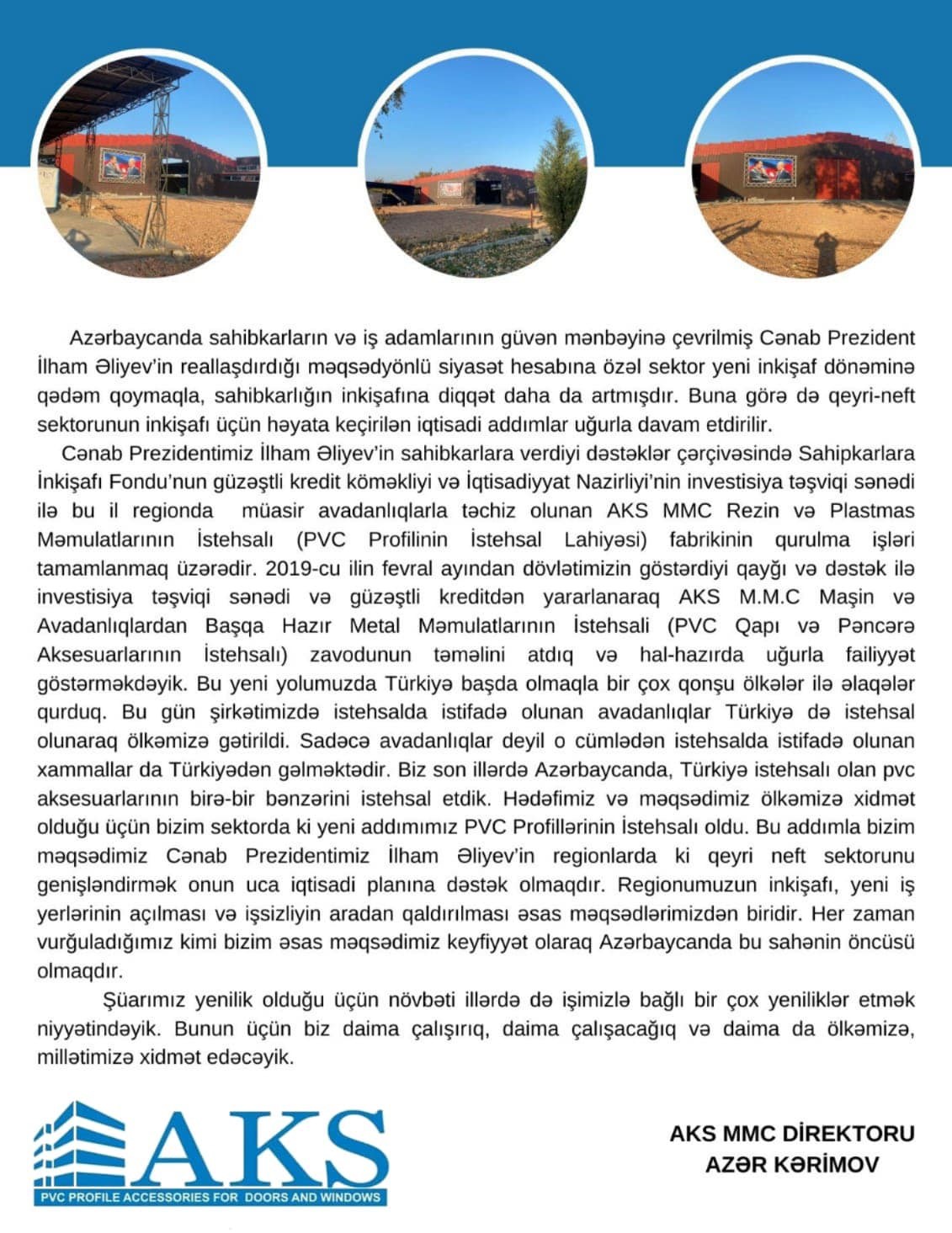 "A.K.S." MMC-nin direktoru Azər Kərimov bildirib ki, yeni açılacaq müəssisədə PVC qapı və pəncərə aksesuarları istehsal olunacaq. Şirkət fəaliyyətinə PVC profillərin istehsalı ilə başlayıb.