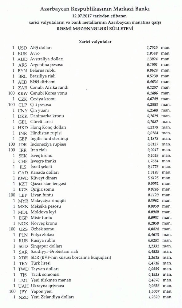 İyulun 12-nə Mərkəzi Bankın açıqladığı rəsmi Dollar/manat məzənnəsi İyulun 11-i ilə müqayisədə düşərək 1,7020 manat olub, Avro/manat məzənnəsi isə 1.9548 manata qalxıb.