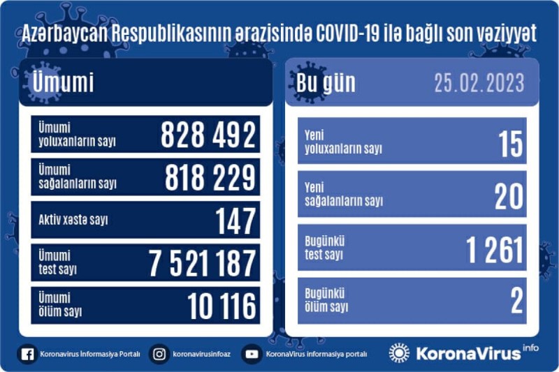 Azərbaycan Respublikasında koronavirus (COVID-19) infeksiyasına 15 yeni yoluxma faktı qeydə alınıb, 20 nəfər müalicə olunaraq sağalıb.